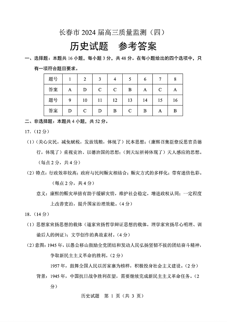 吉林省长春市2024届高三下学期四模考试历史答案