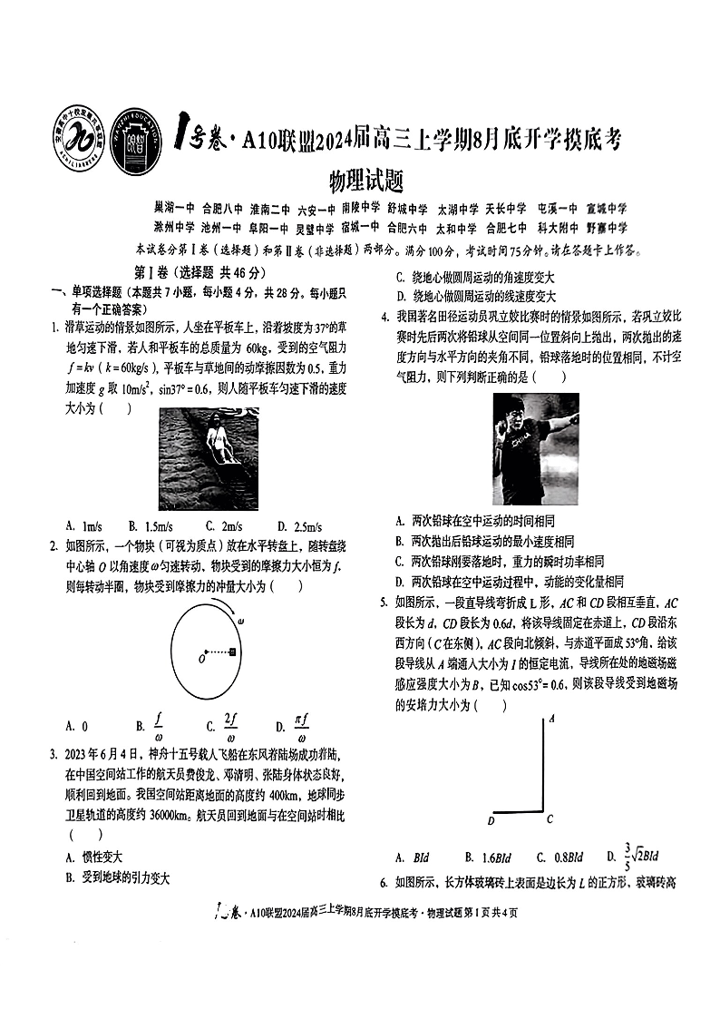安徽省A10联盟2024届高三上学期8月开学摸底考试物理