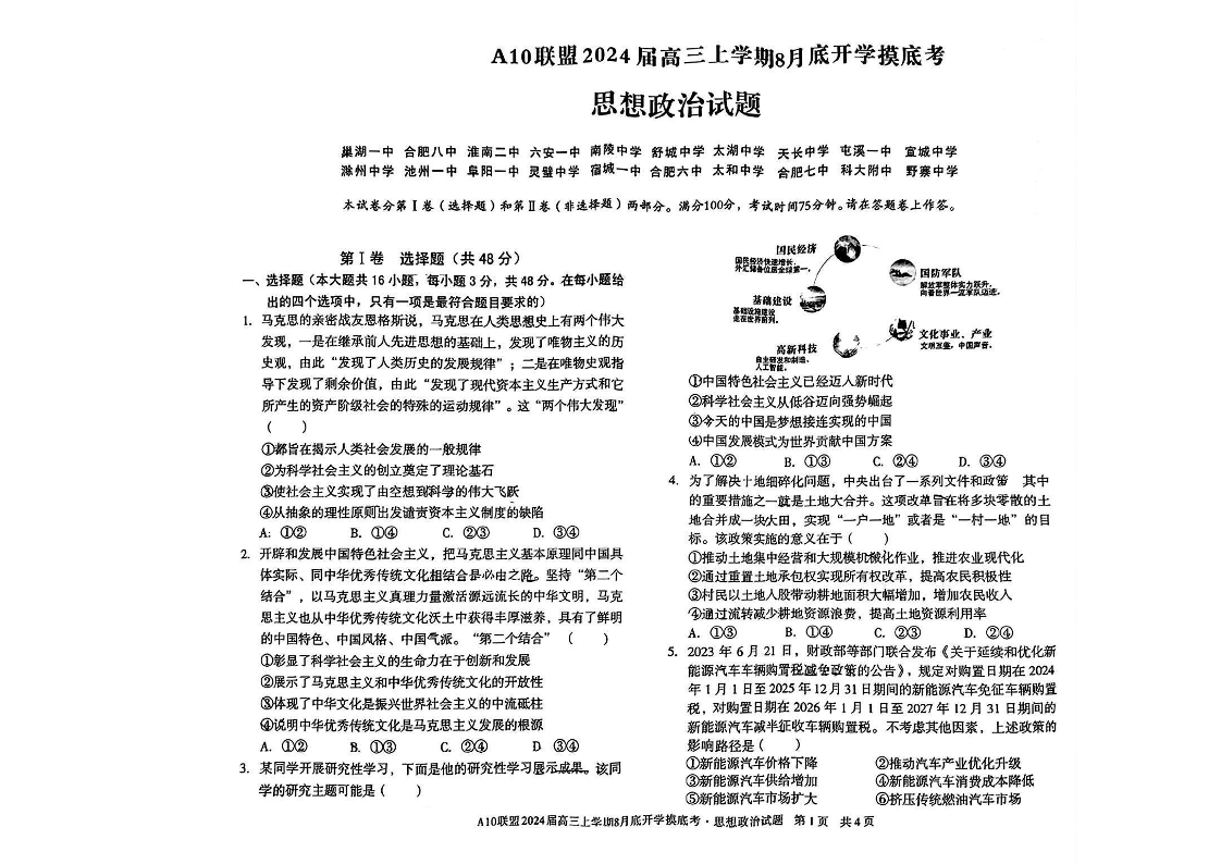 安徽省A10联盟2024届高三上学期8月开学摸底考试政治+答案