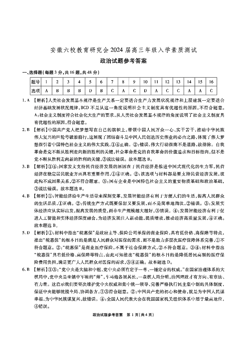 安徽省六校教育研究会2024届高三入学考试政治答案