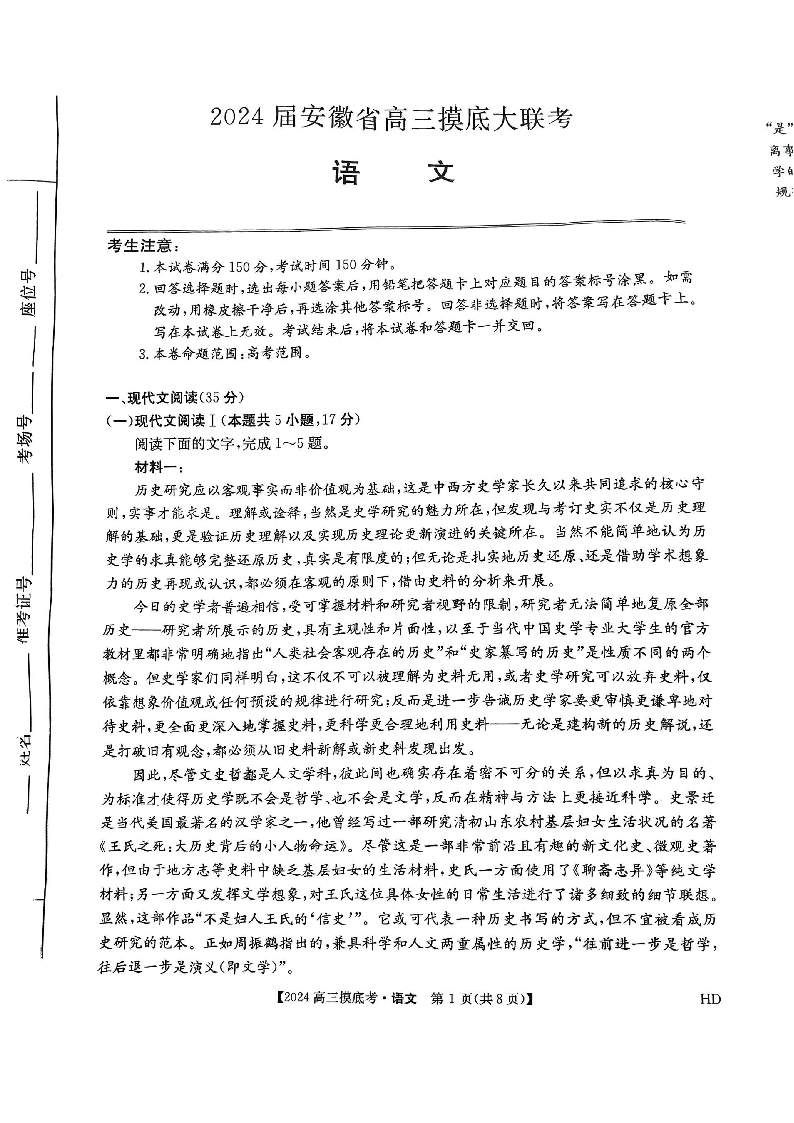 安徽省皖南八校2024届高三上学期8月摸底考试语文
