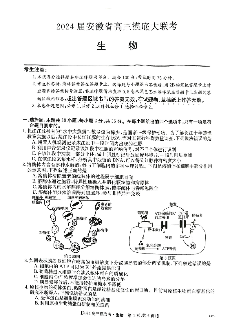 安徽省皖南八校2024届高三上学期8月摸底考试生物