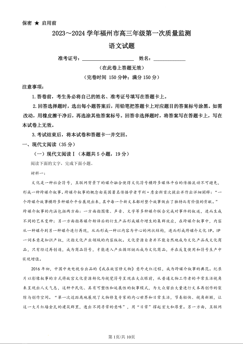 福建省福州市2024届高三上学期第一次质量监测语文(原卷版)
