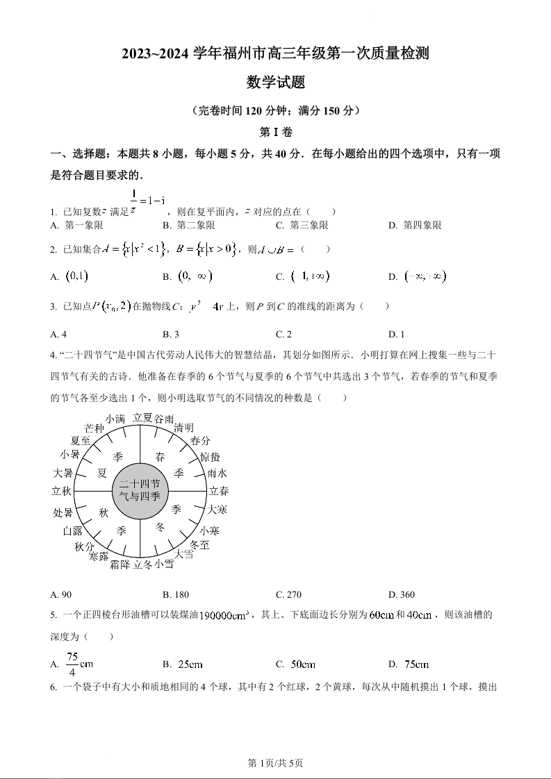 福建省福州市2024届高三上学期第一次质量监测数学(原卷版)
