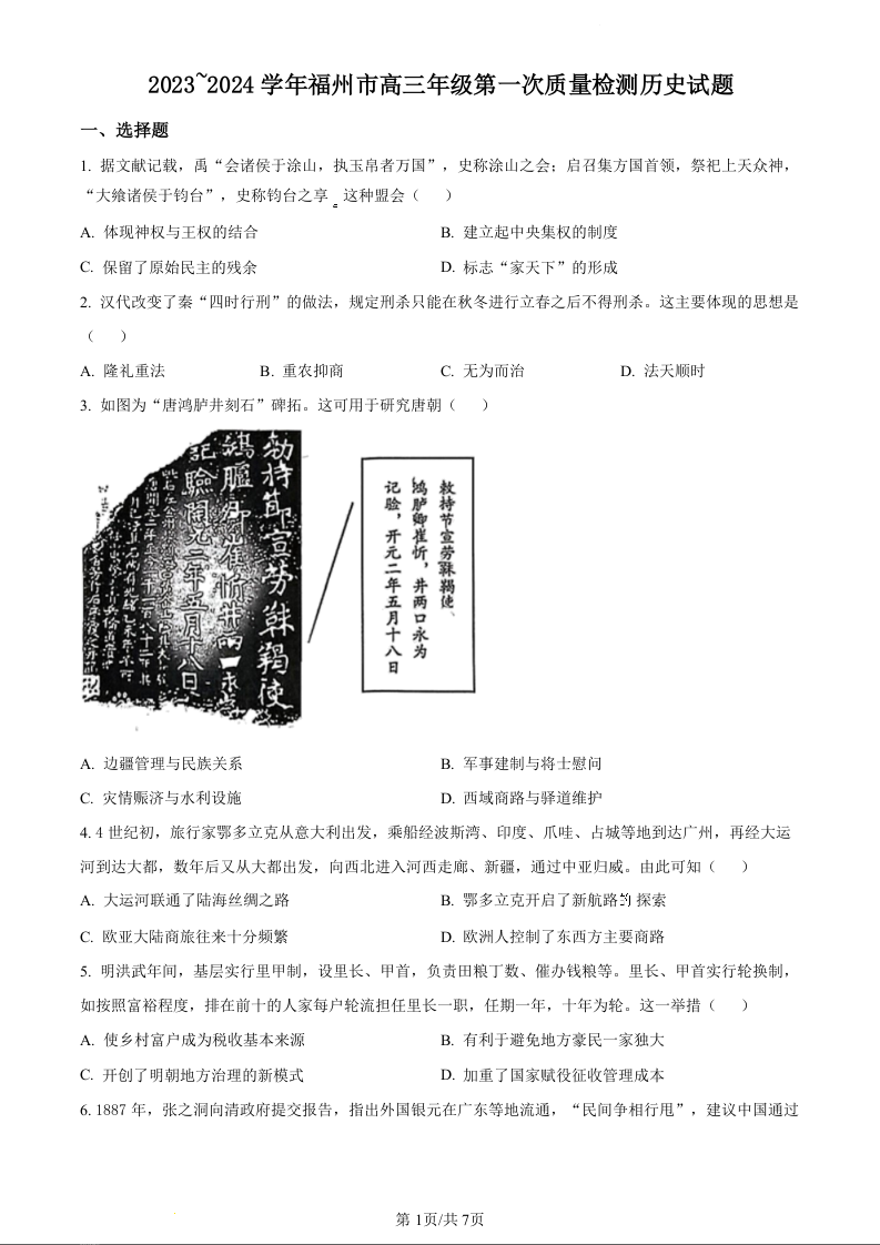 福建省福州市2024届高三上学期第一次质量监测历史(原卷版)