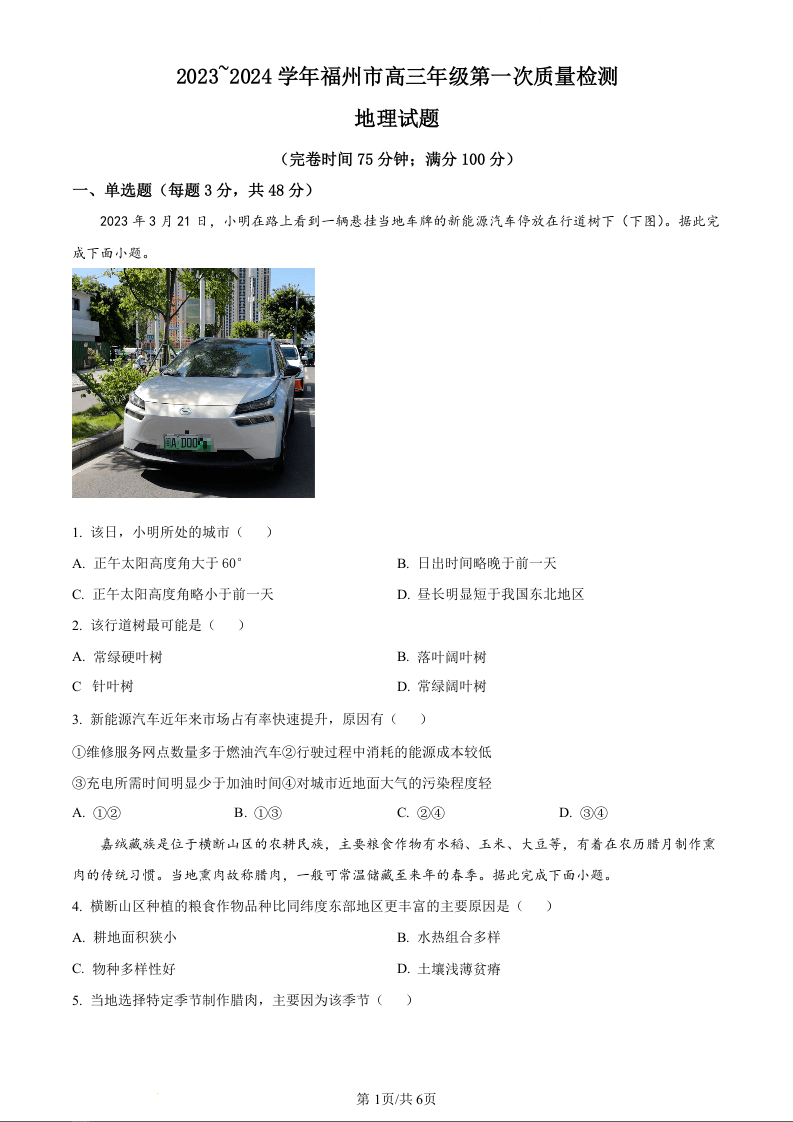 福建省福州市2024届高三上学期第一次质量监测地理(原卷版)