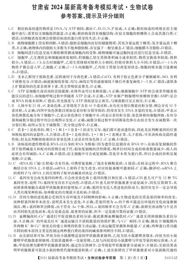 甘肃省 2024 届新高考开学模拟考试生物答案