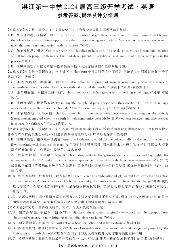 广东省茂名湛江市第一中学2024届高三上学期开学考英语答案