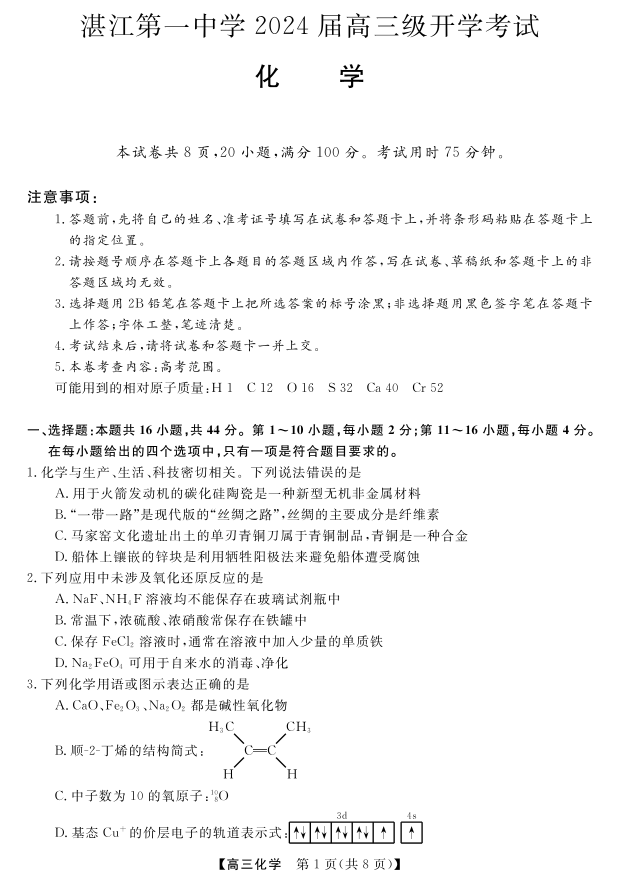 广东省茂名湛江市第一中学2024届高三上学期开学考化学