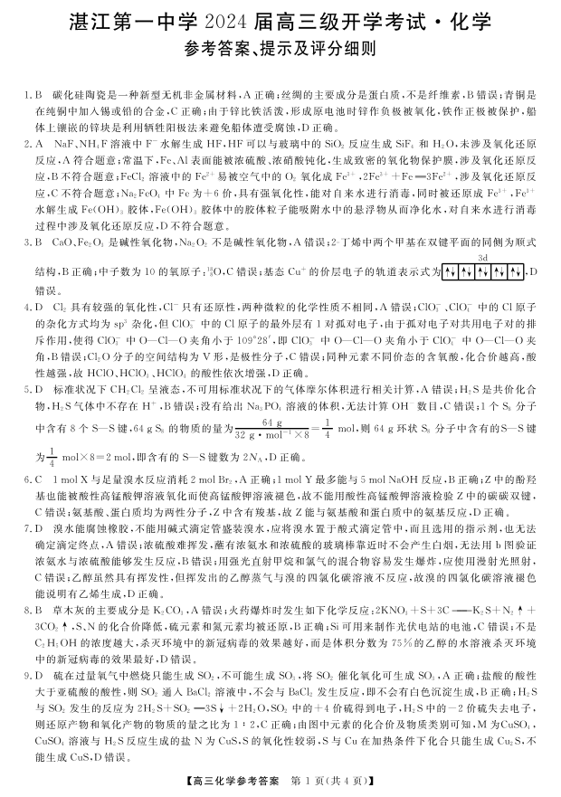 广东省茂名湛江市第一中学2024届高三上学期开学考化学答案