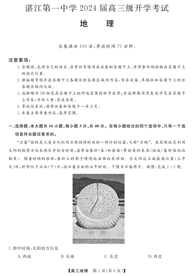 广东省茂名湛江市第一中学2024届高三上学期开学考地理