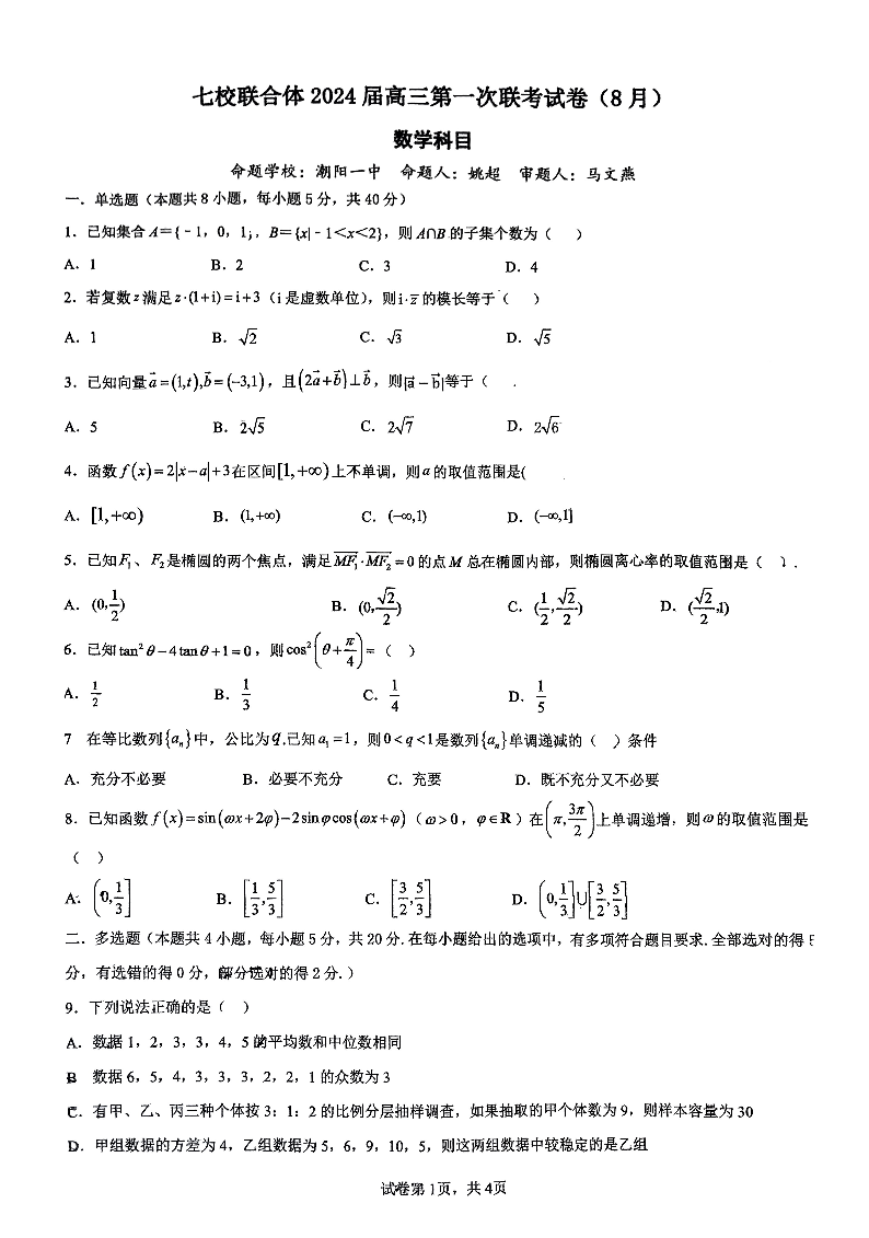 广东省七校2024届高三上学期第一次联考数学