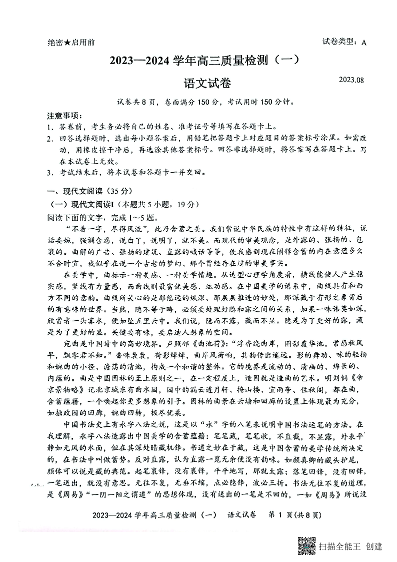 广东省深圳市罗湖区2024届高三上学期开学模拟考(质量检测一)语文