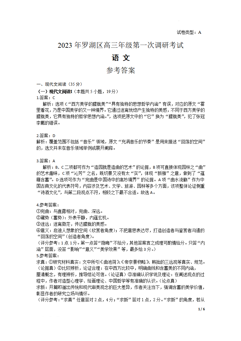 广东省深圳市罗湖区2024届高三上学期开学模拟考(质量检测一)语文答案
