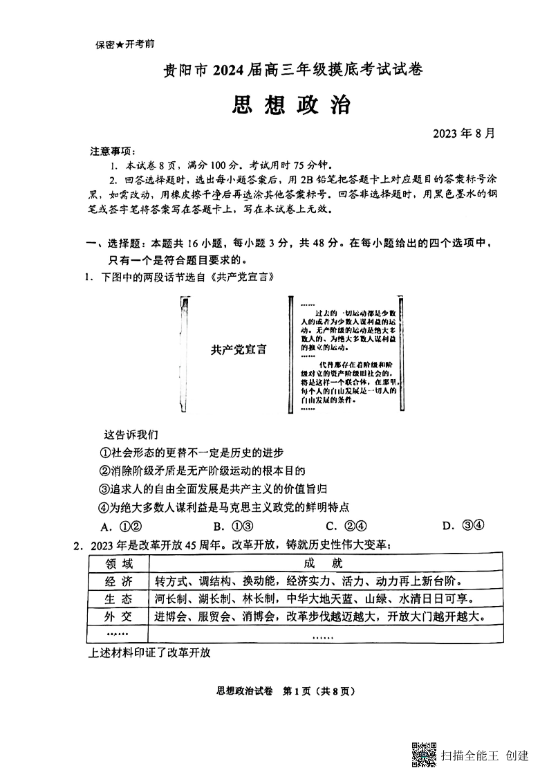 贵州省贵阳市2024届高三上学期开学考试政治