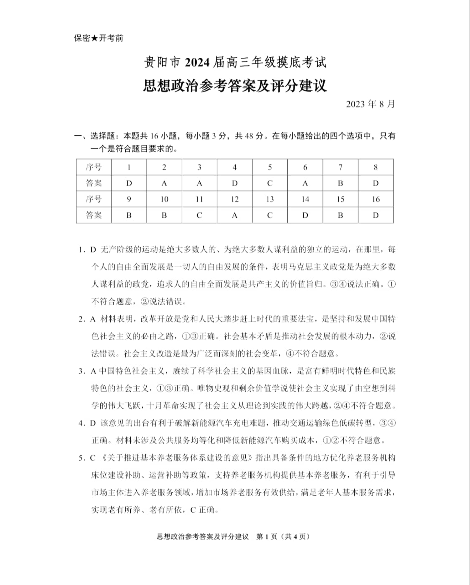 贵州省贵阳市2024届高三上学期开学考试政治答案