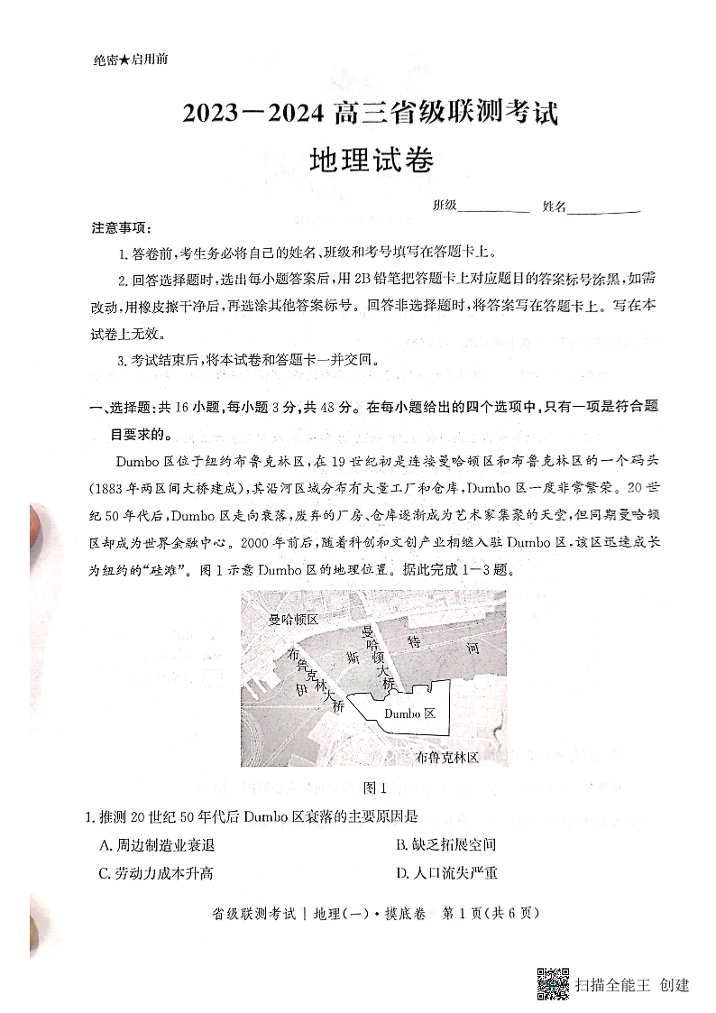 河北省2024届高三上学期省级联测考试地理