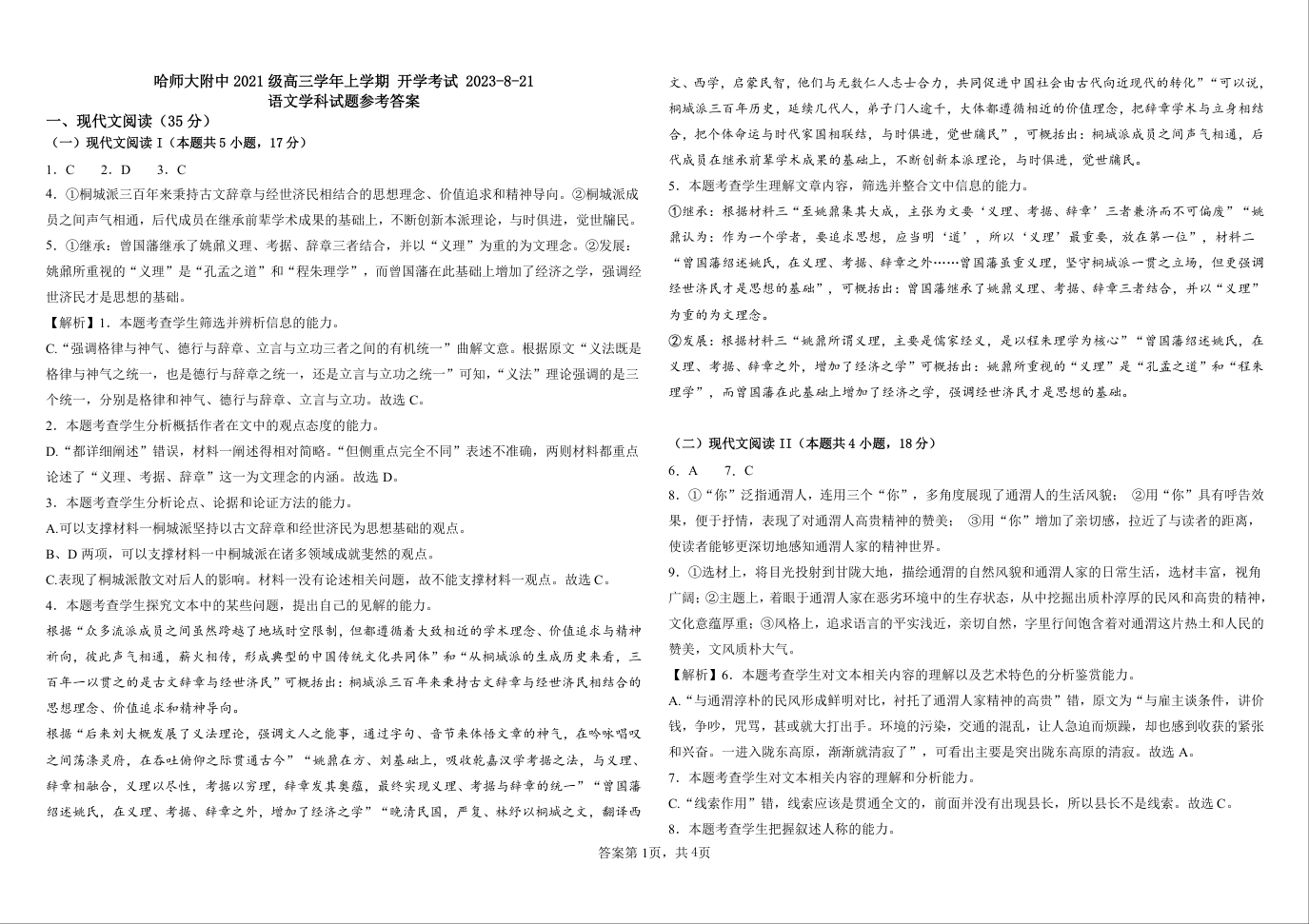 黑龙江省哈尔滨师范大学附属中学2024届高三上学期开学考试语文答案
