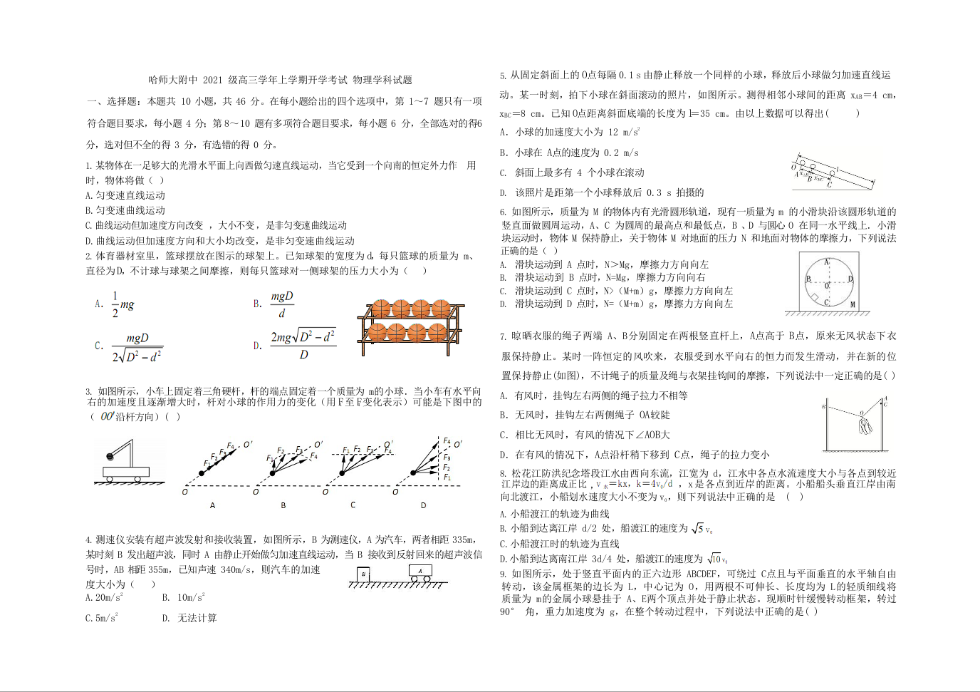黑龙江省哈尔滨师范大学附属中学2024届高三上学期开学考试物理