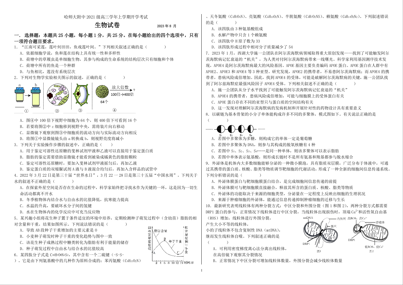 黑龙江省哈尔滨师范大学附属中学2024届高三上学期开学考试生物+答案
