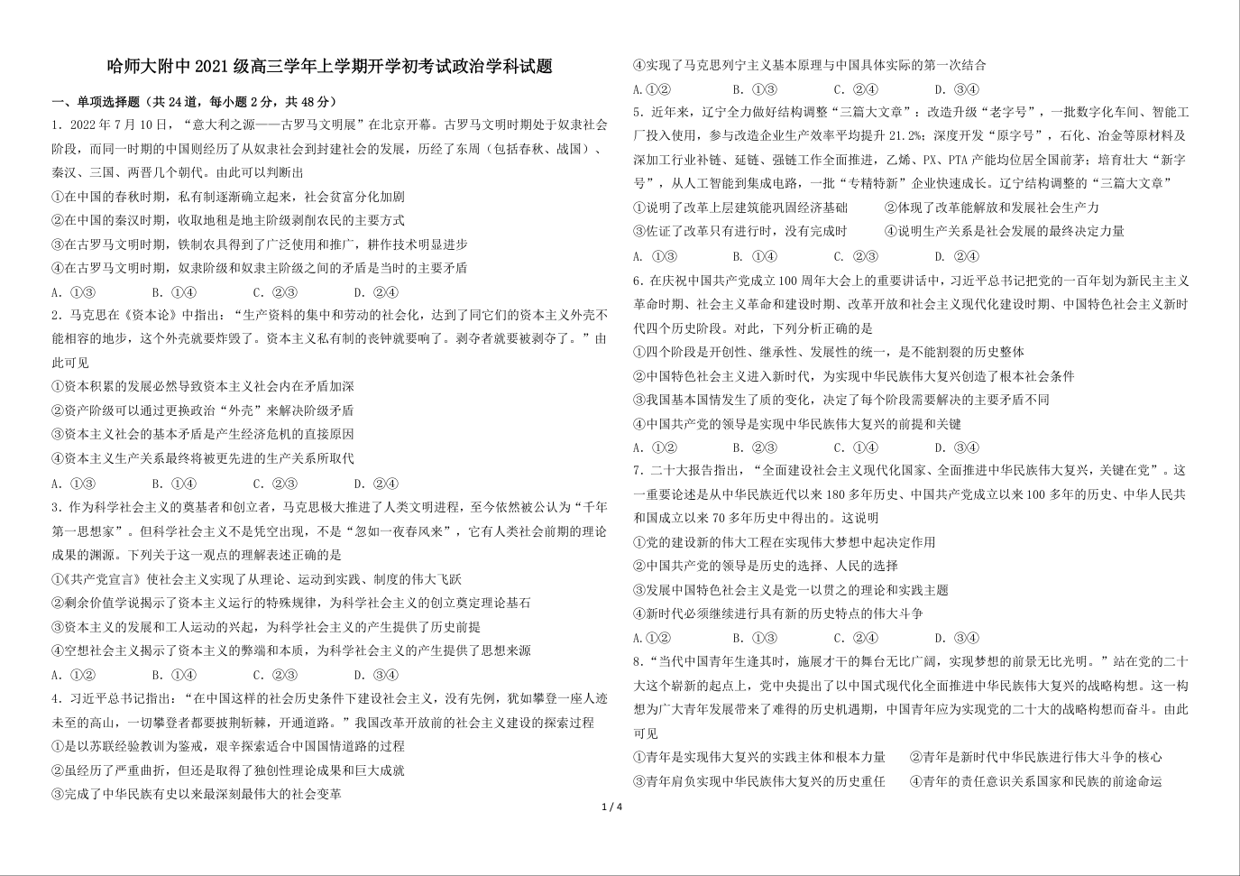 黑龙江省哈尔滨师范大学附属中学2024届高三上学期开学考试政治