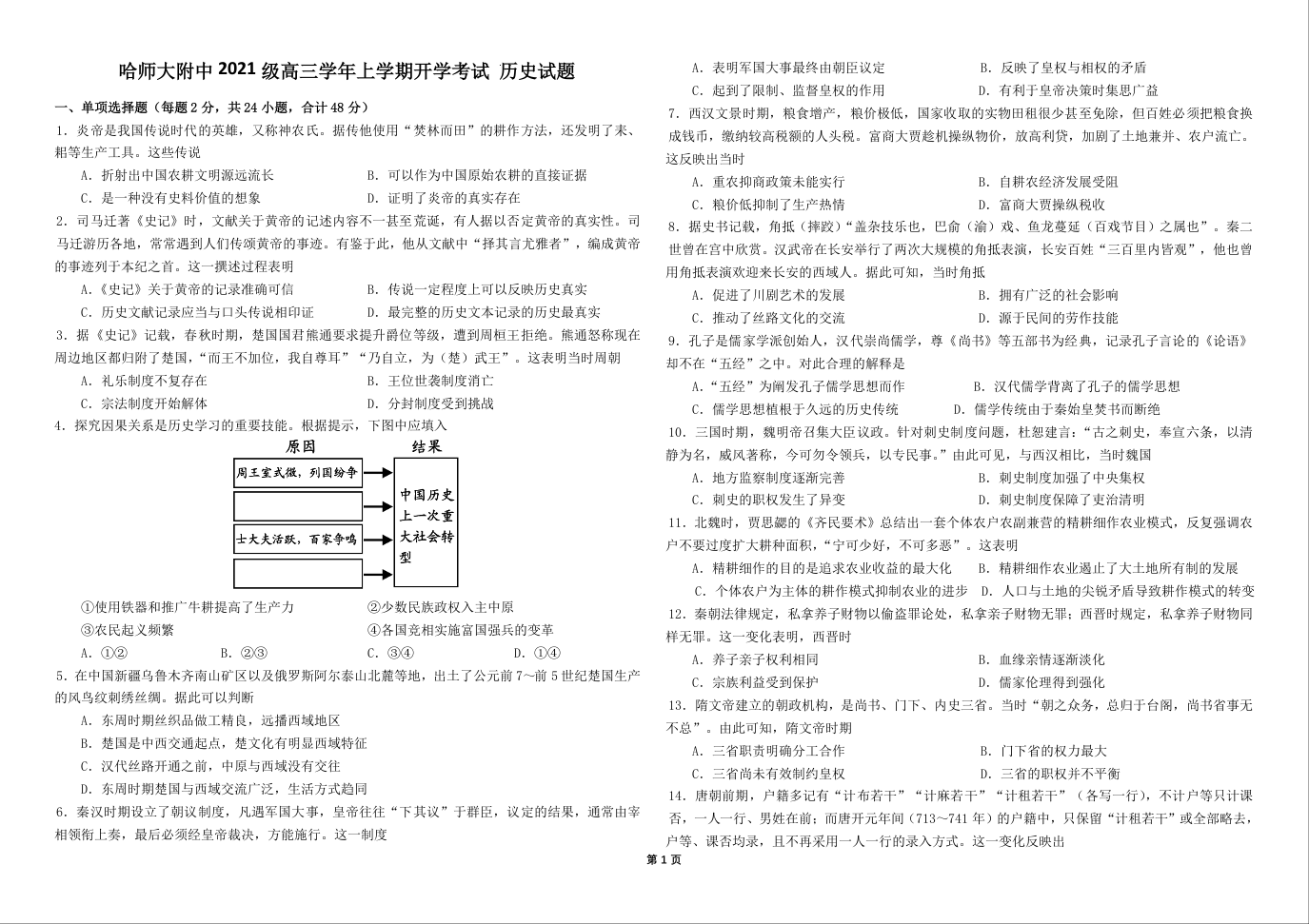 黑龙江省哈尔滨师范大学附属中学2024届高三上学期开学考试历史