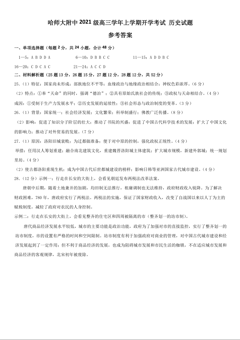 黑龙江省哈尔滨师范大学附属中学2024届高三上学期开学考试历史答案