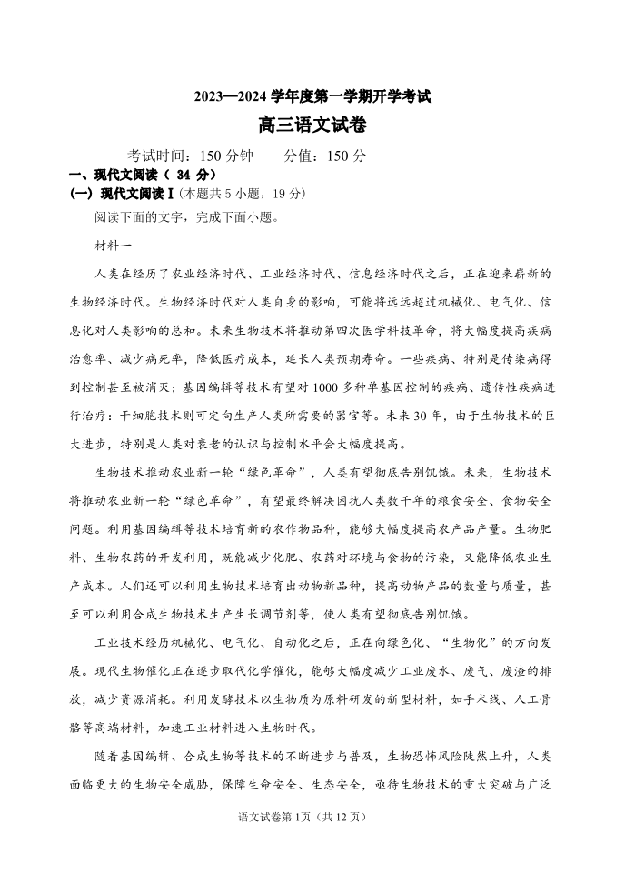 黑龙江省牡丹江市第三高级中学2024届高三上学期开学考试语文