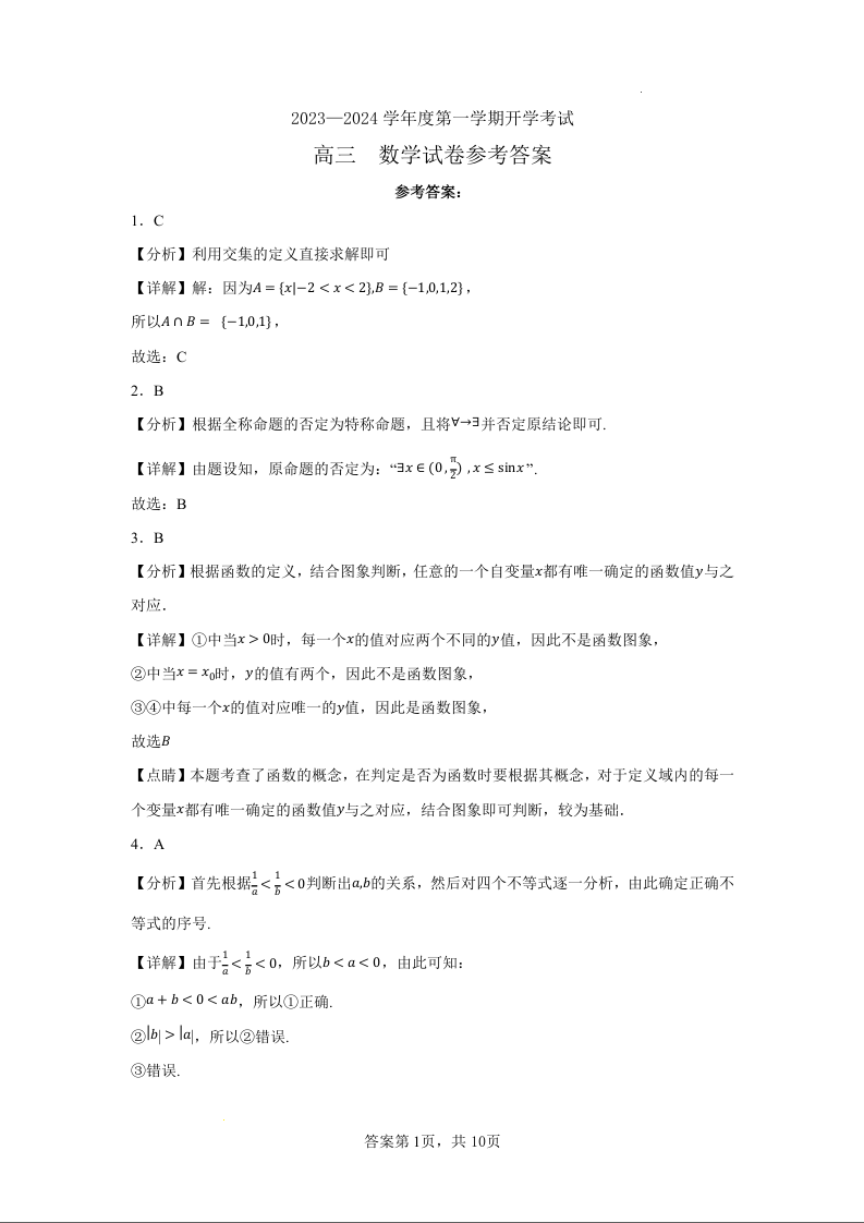 黑龙江省牡丹江市第三高级中学2024届高三上学期开学考试数学答案