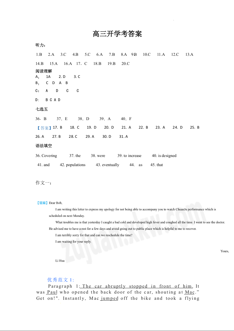 黑龙江省牡丹江市第三高级中学2024届高三上学期开学考试英语答案