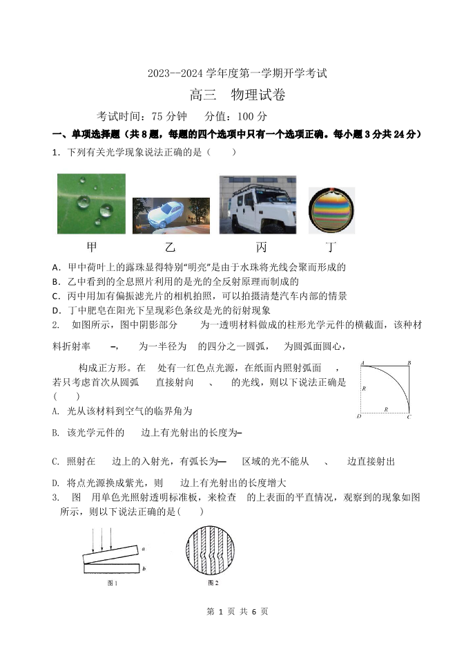 黑龙江省牡丹江市第三高级中学2024届高三上学期开学考试物理
