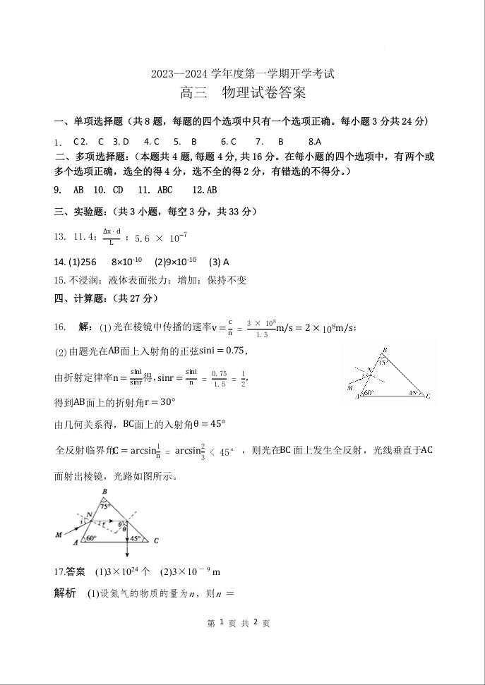 黑龙江省牡丹江市第三高级中学2024届高三上学期开学考试物理答案