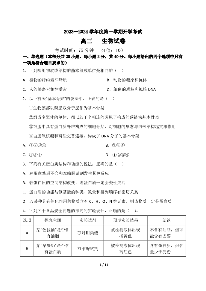 黑龙江省牡丹江市第三高级中学2024届高三上学期开学考试生物