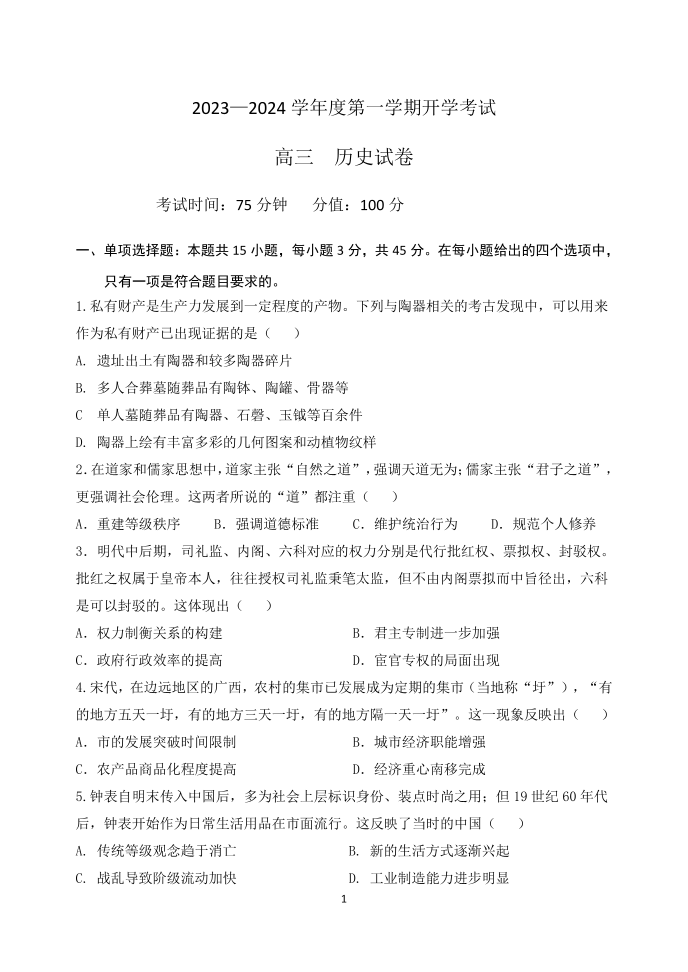 黑龙江省牡丹江市第三高级中学2024届高三上学期开学考试历史