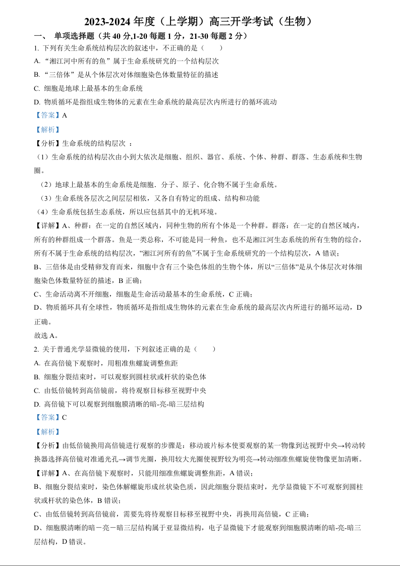 黑龙江省双鸭山市第一中学2024届高三上学期开学考试生物(精品解析版)