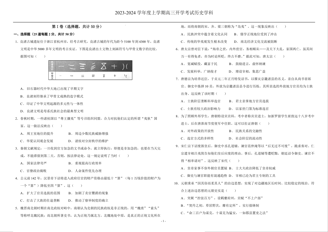 黑龙江省双鸭山市第一中学2024届高三上学期开学考试历史