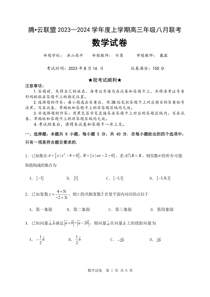 湖北省腾云联盟2024届高三上学期8月联考数学