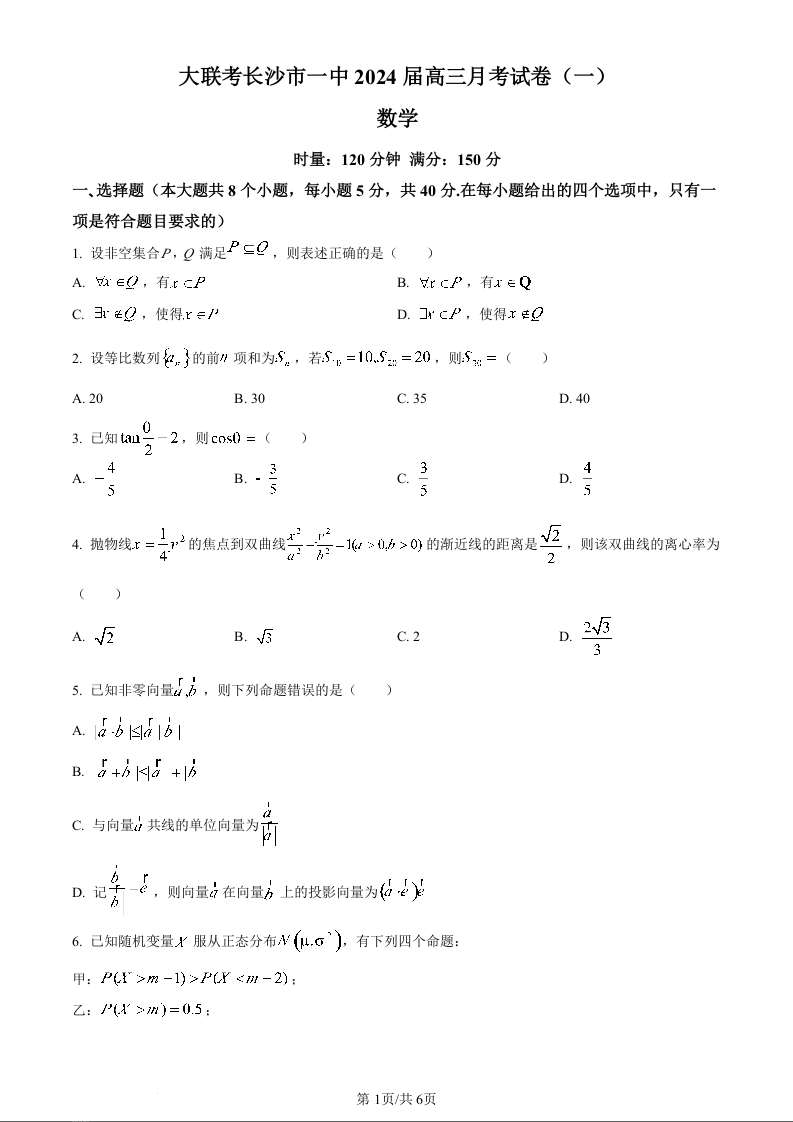 湖南省长沙市第一中学2024届高三上学期月考(一)数学(原卷版)
