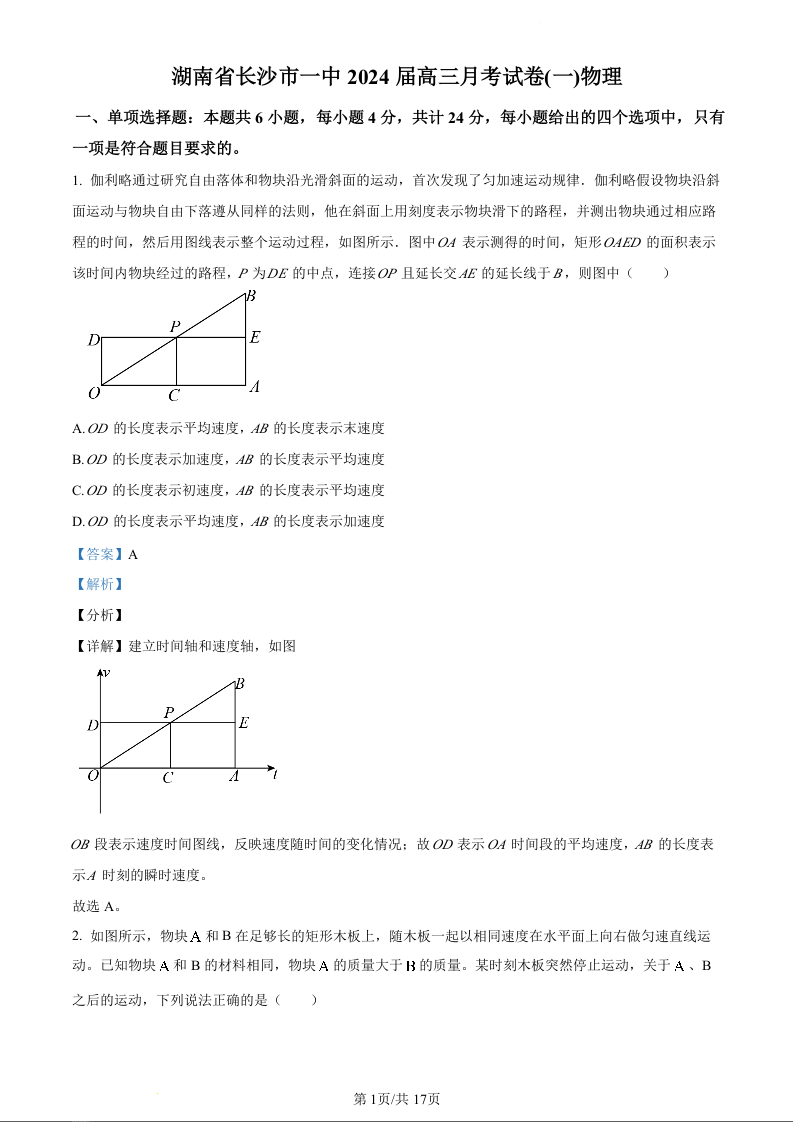 湖南省长沙市第一中学2024届高三上学期月考(一)物理(精品解析版)