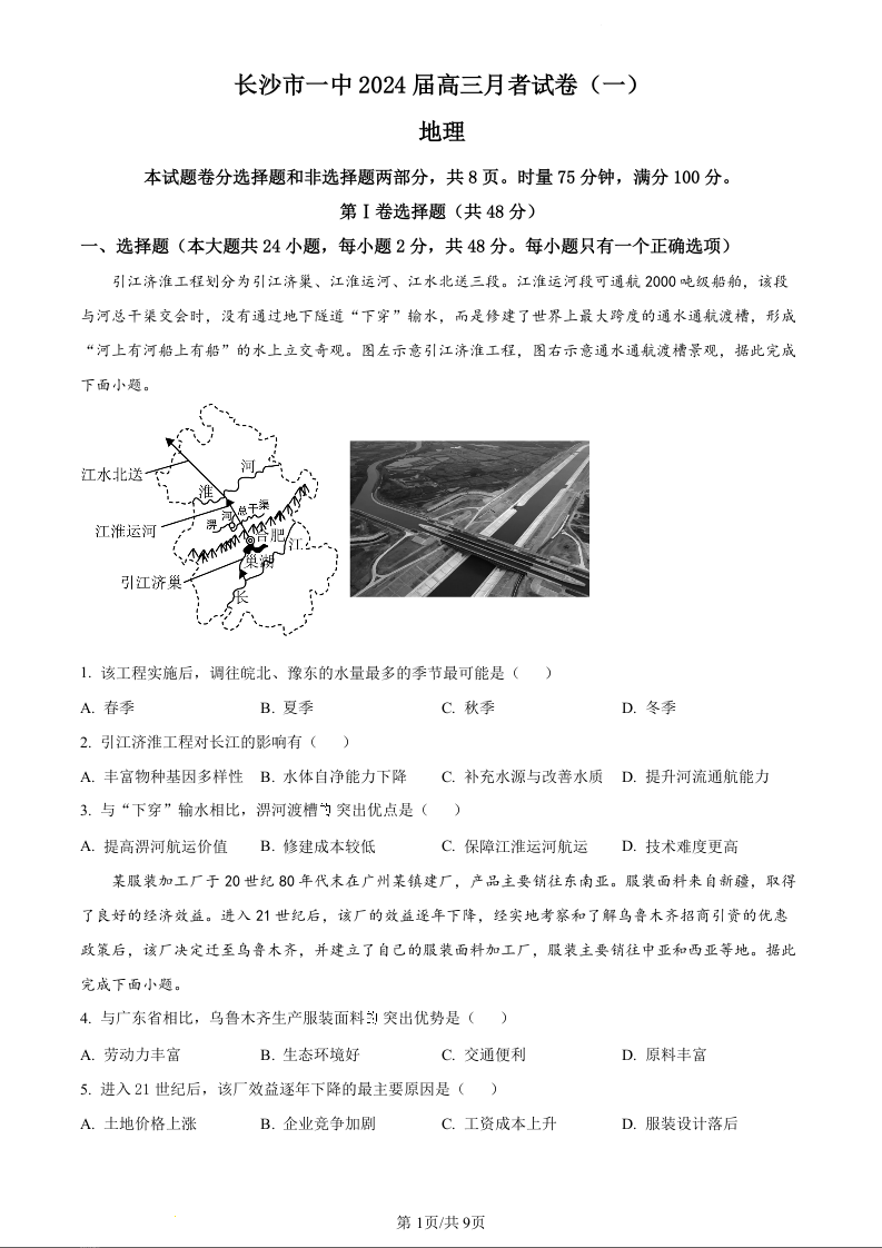 湖南省长沙市第一中学2024届高三上学期月考(一)地理(原卷版)