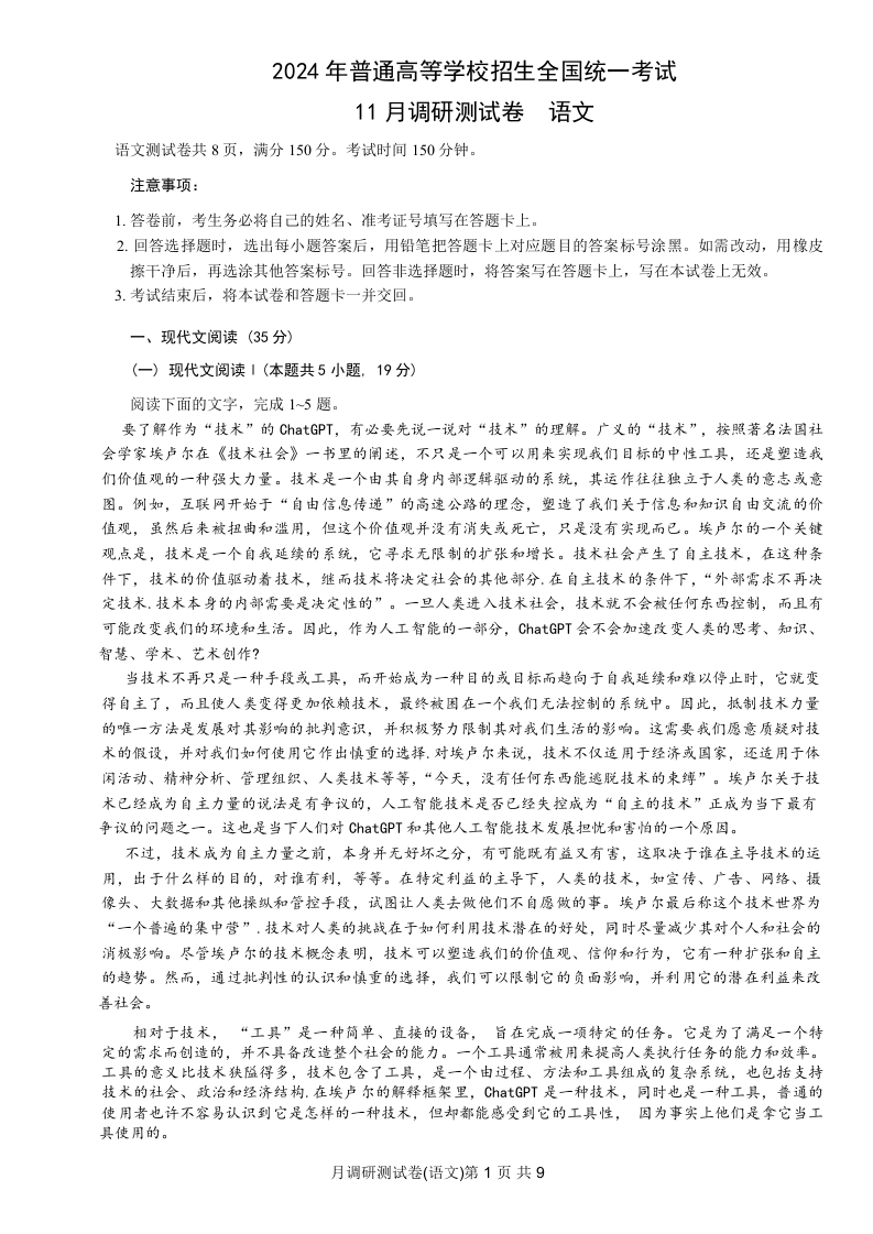重庆康德半期统考2024年普通高等学校招生全国统一考试高三11月调研卷语文