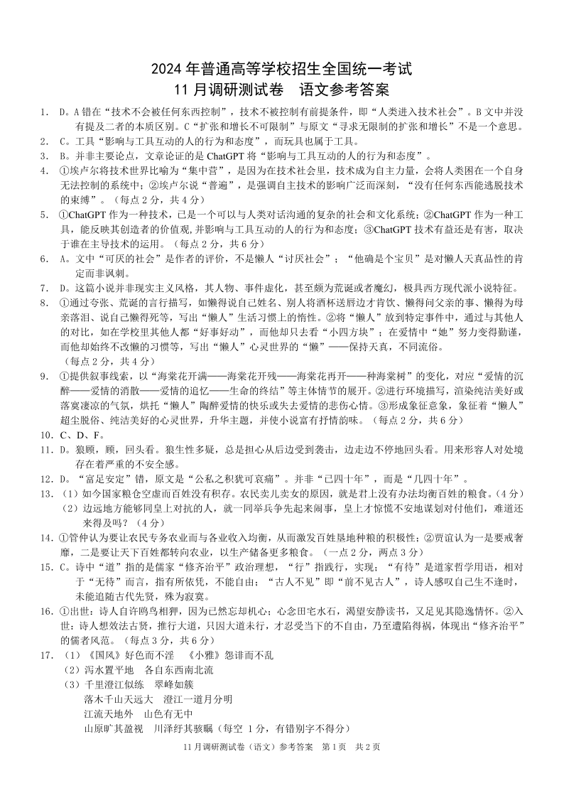 重庆康德半期统考2024年普通高等学校招生全国统一考试高三11月调研卷语文答案