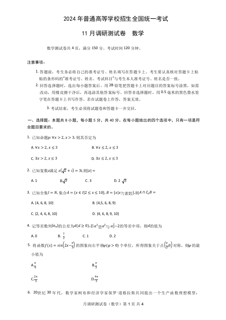 重庆康德半期统考2024年普通高等学校招生全国统一考试高三11月调研卷数学