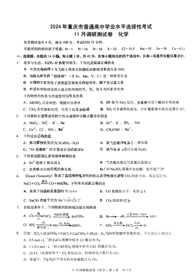 重庆康德半期统考2024年普通高等学校招生全国统一考试高三11月调研卷化学