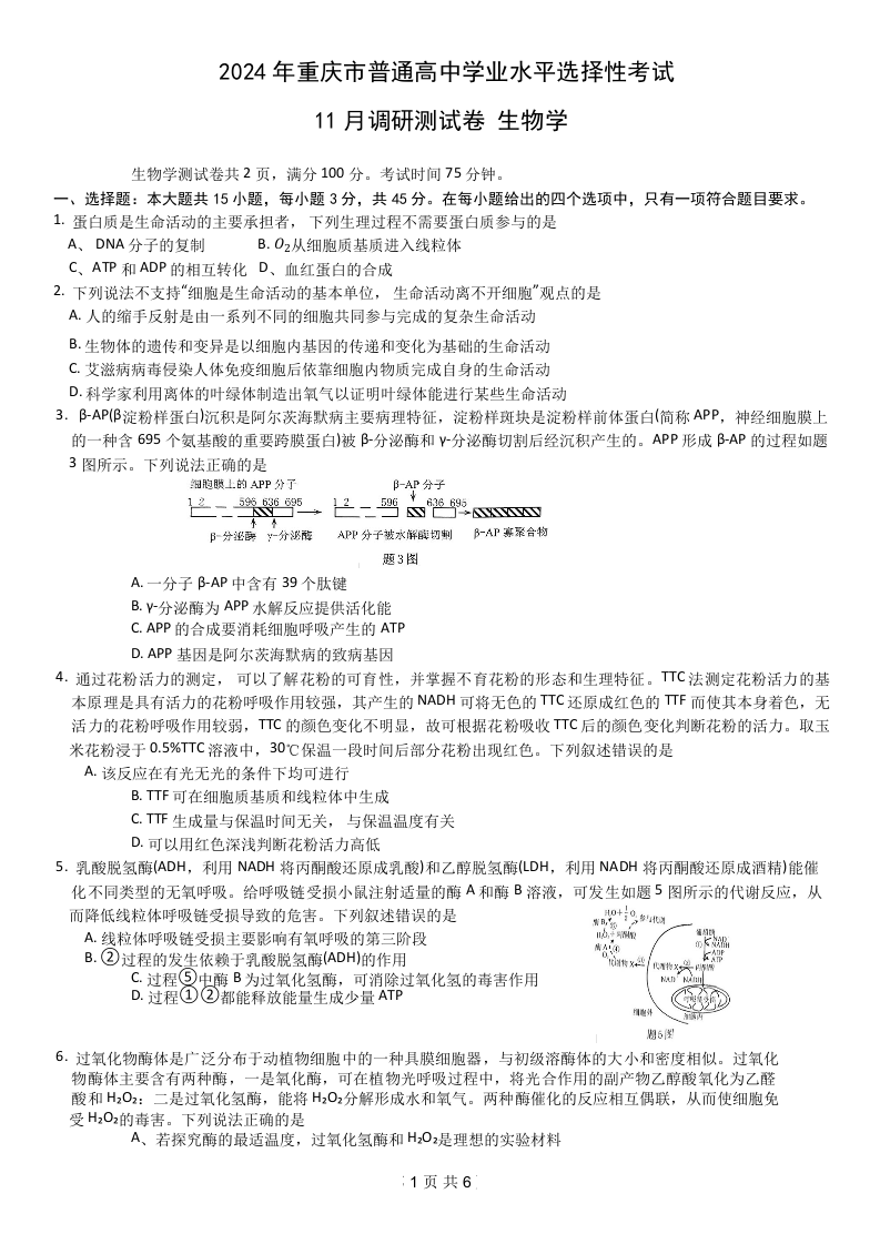 重庆康德半期统考2024年普通高等学校招生全国统一考试高三11月调研卷生物