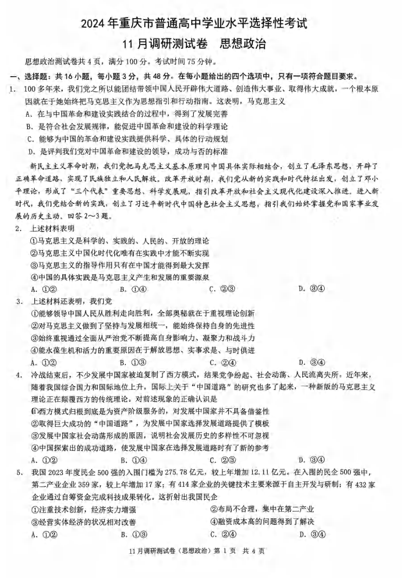 重庆康德半期统考2024年普通高等学校招生全国统一考试高三11月调研卷政治