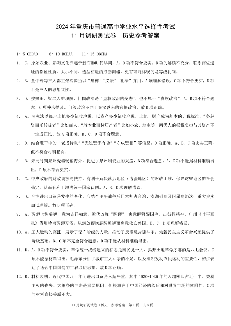 重庆康德半期统考2024年普通高等学校招生全国统一考试高三11月调研卷历史答案