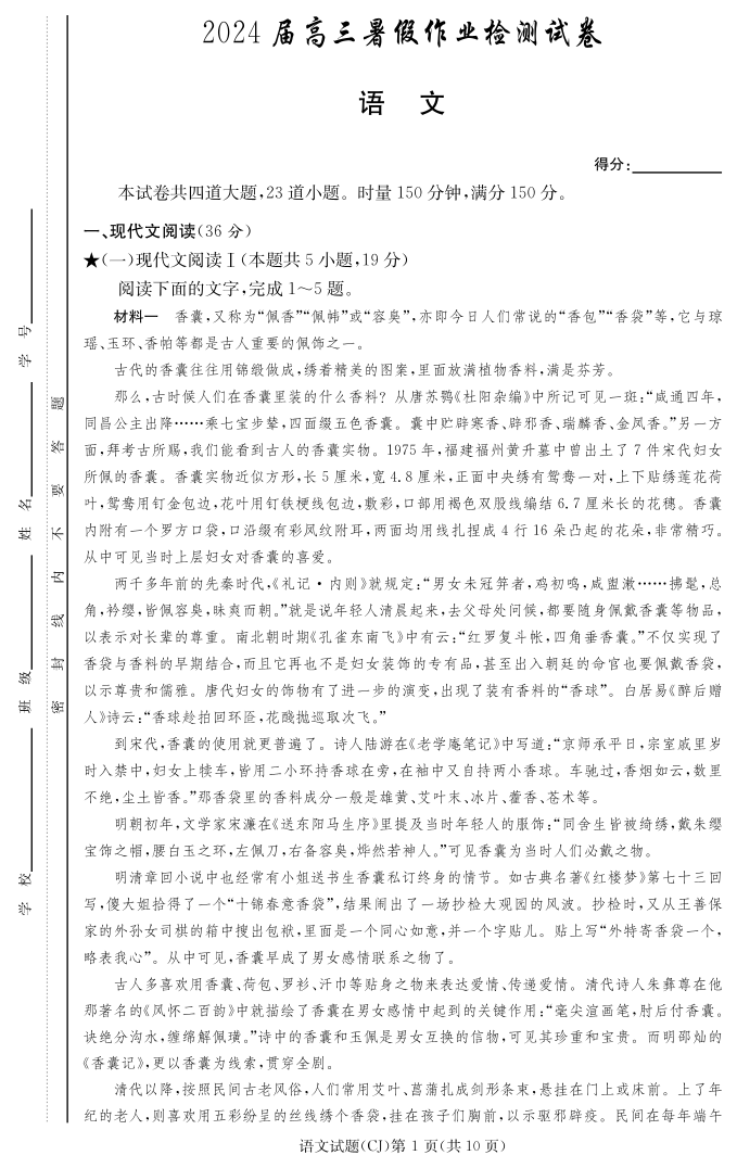 湖南省长沙市长郡中学2024届高三上学期入学考试语文