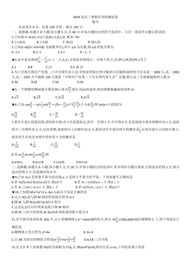 湖南省长沙市长郡中学2024届高三上学期入学考试数学
