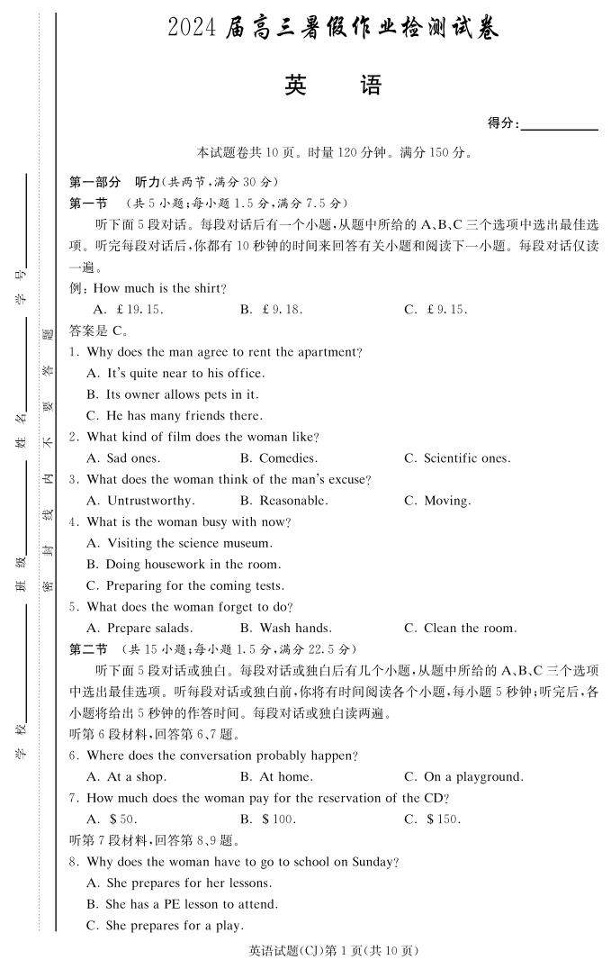 湖南省长沙市长郡中学2024届高三上学期入学考试英语